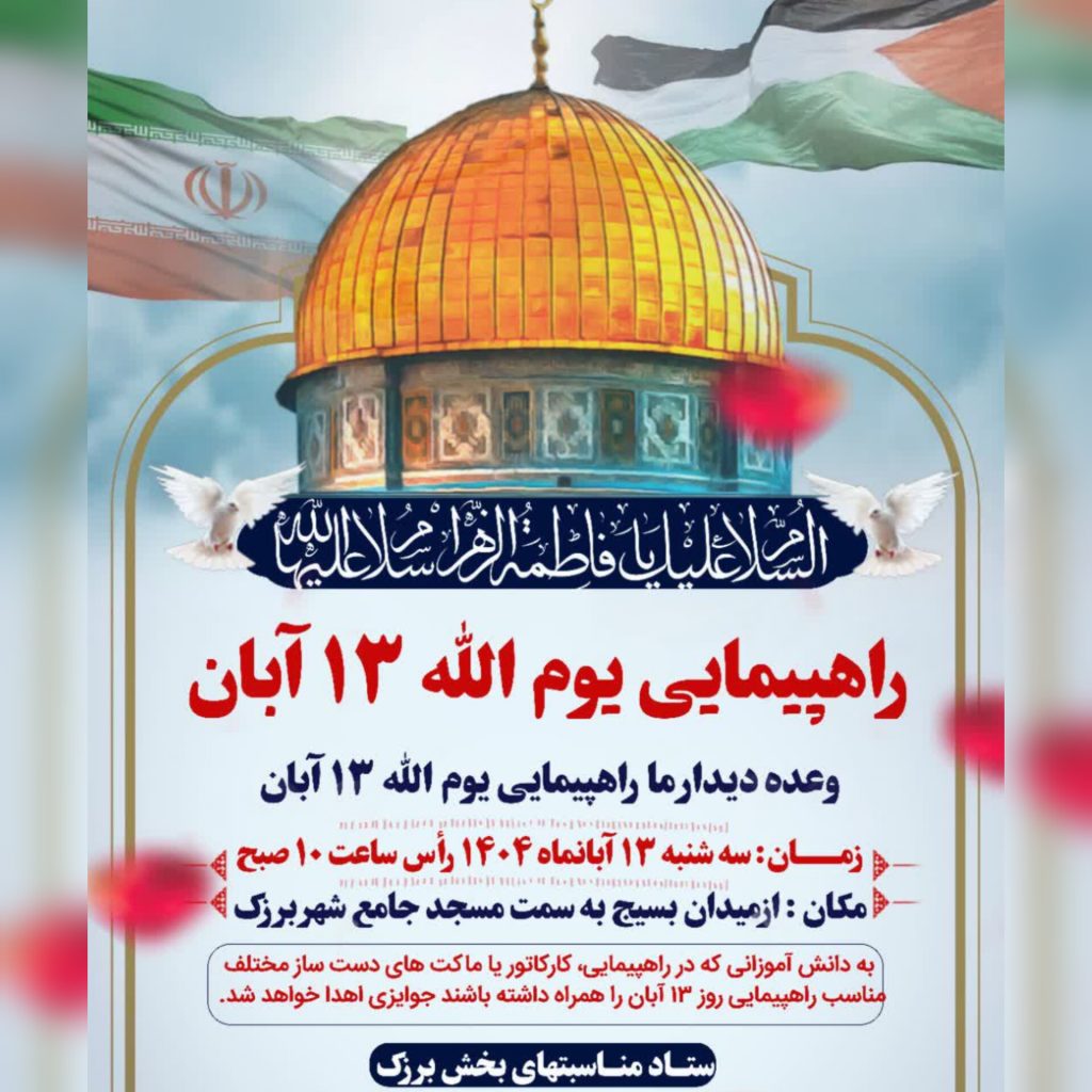 ▪️اَلسَّلامُ عَلَیکِ یا فاطِمَةُ الزَّهراء(س) 🇮🇷راهپیمایی یوم الله ۱۳ آبان🇮🇷 🔸سه شنبه ۱۳ آبان مصادف با سالروز شهادت حضرت زهرا سلام الله علیها 🔸رأس ساعت ۱۰ صبح 🔸از میدان بسیج به سمت دبستان آیتالله طالقانی برزک ـــــــــــــــــــــــــــــ (( به دانش آموزانی که در راهپیمایی، کارکاتور یا ماکت های دست ساز مختلف مناسب راهپیمایی روز ۱۳ […]