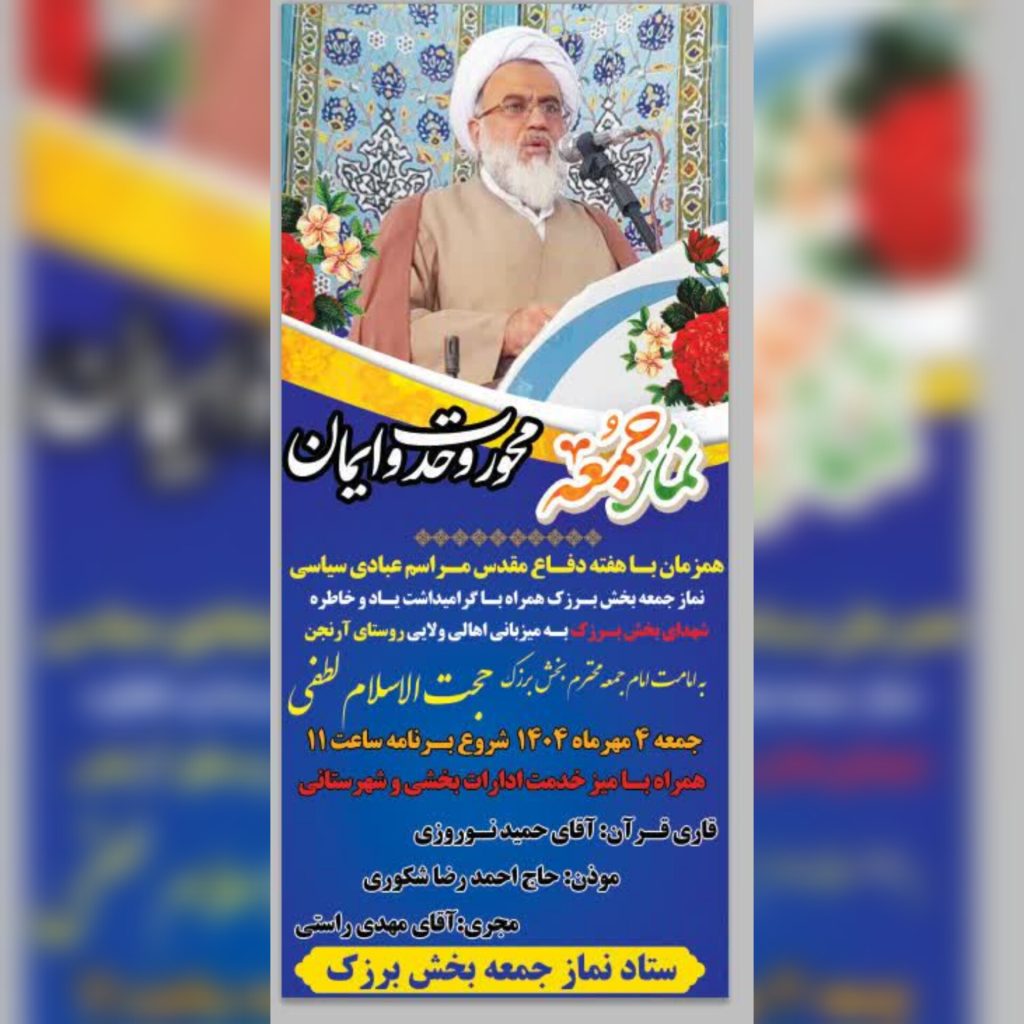 💠مراسم نماز عبادی سیاسی جمعه ✨همزمان با هفته دفاع مقدس و گرامیداشت یاد و خاطره شهدای بخش برزک ✅ بهمراه میز خدمت ادارات شهرستان و بخش 🕌 مکان: روستای آرنجن ـ مسجد جامع 🎤 مداح و قاری قرآن: کربلایی حمیدرضا نوروزی 🎤 مؤذن: حاج احمدرضا شکوری 🎤 مجری : آقای مهدی راستی 🗓 زمان: جمعه […]