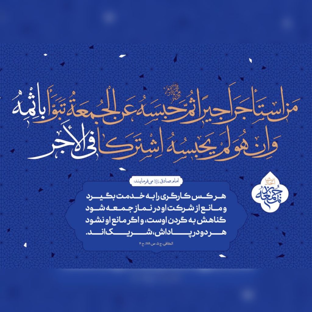 📜 حدیث نماز جمعه ▫️ قالَ الاِمامُ الصّادِقُ عليه السلام: 🔆 منِ استَأجَرَ أَجِیراً ثُمَّ حَبَسَهُ عَنِ الجُمُعَةِ تَبَوَّأَ بِإِثمِهِ، وَ إِن هُوَ لَم یَحبِسهُ اشتَرَكَا فِی الأَجرِ. 🏷 هر كس کارگری را به خدمت بگیرد و مانع از شركت او در نماز جمعه شود، گناهش به گردن اوست، و اگر مانع او نشود، هر […]