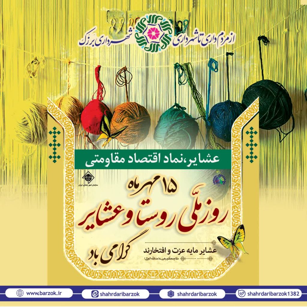 عشایر، نماد اقتصاد مقاومتی عشایر مایه عزت و افتخارند. مقام معظم رهبری (مدظله العالی) ۱۵ مهر ماه؛روز ملی روستا و عشایر گرامی باد. #شهرداری_برزک #برزک_نگین_سبز_کوهستان #حمیدرضا_دهقانی #َشهردار_مردمی #از_مردمداری_تا_شهرداری کانال های ارتباطی : [ ایتا ، بله ، روبیکا ] روابط عمومی شهرداری برزک