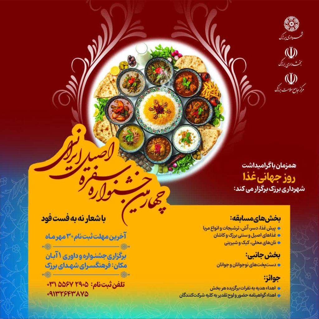 همزمان با گرامیداشت روز جهانی غذا شهرداری برزک برگزار می کند. ✅ چهارمین جشنواره سفره اصیل ایرانی با شعار نه به فست فود 🔸 بخشهای مسابقه: *پیش غذا، دسر، آش، ترشیجات و انواع مربا *غذاهای اصیل و سنتی برزک و کاشان *نانهای محلی، کیک و شیرینی 🔹 بخش جنبی: *دستپختهای نوجوانان و جوانان 📆 آخرین […]